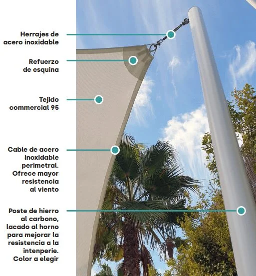 Las velas de sombra están fabricadas con tejidos técnicos que filtran hasta el 98% de la radiación UV. Esto ayuda a prevenir quemaduras y golpes de calor en niños y adultos, sobre todo en los meses de más calor. - Confort térmico