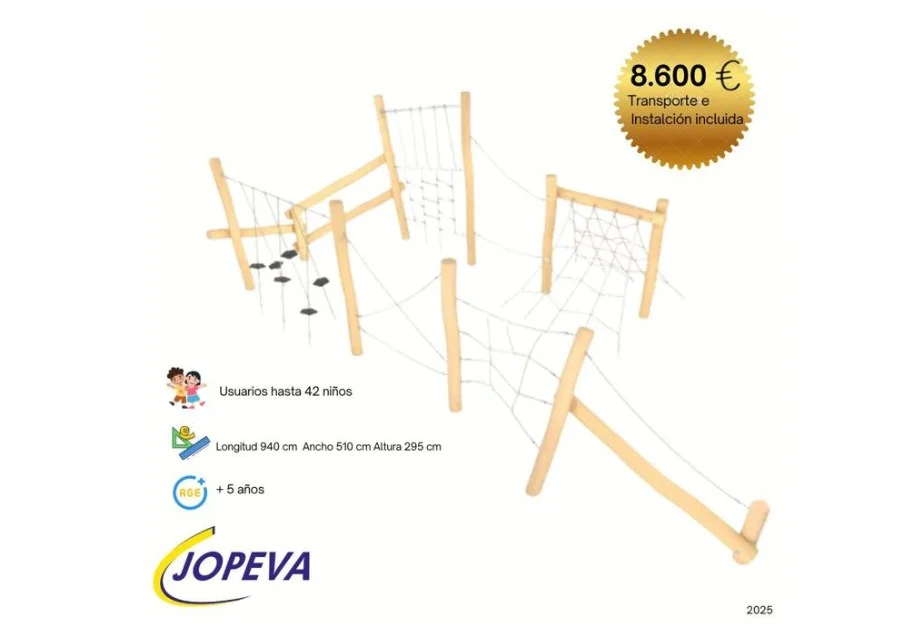 Gran juego multifuncional de exterior pensado para parques infantiles, colegios, comunidades zonas recreativas. Permite acomodar a un número relativamente elevado de niños al mismo tiempo hasta 42, por lo que esta diseñado para uso en entornos de uso colectivo. Especialmente indicado para zonas naturales, ya que al estar fabricado en madera de acacia "robinia", da un aspecto natural y orgánico.
