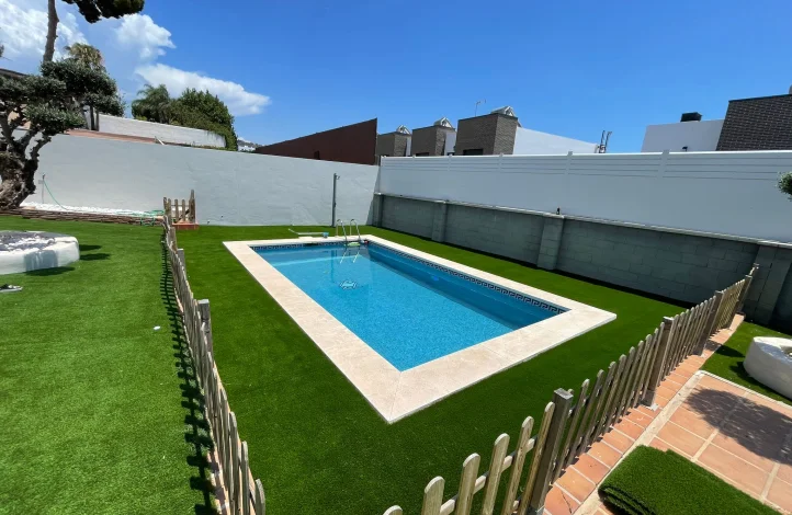 Un espacio exterior moderno, limpio y acogedor que permite disfrutar al máximo de la piscina y el jardín sin preocuparse por el mantenimiento. El césped artificial instalado ofrece una sensación confortable al caminar descalzo y una estética verde vibrante durante todo el año. Este tipo de instalación es ideal para quienes buscan combinar funcionalidad, estética y sostenibilidad.