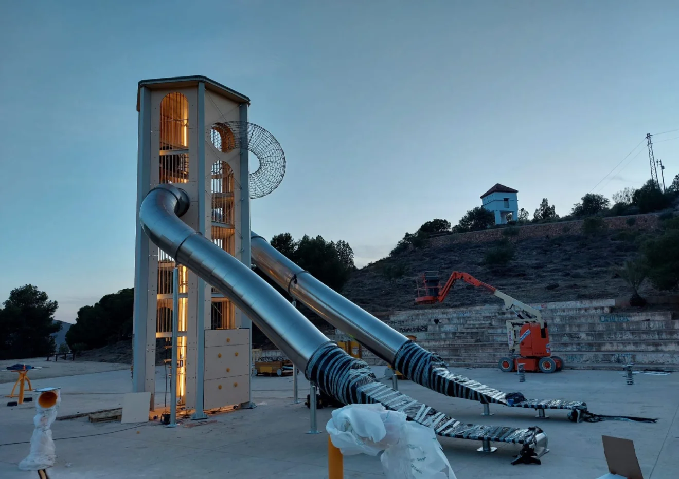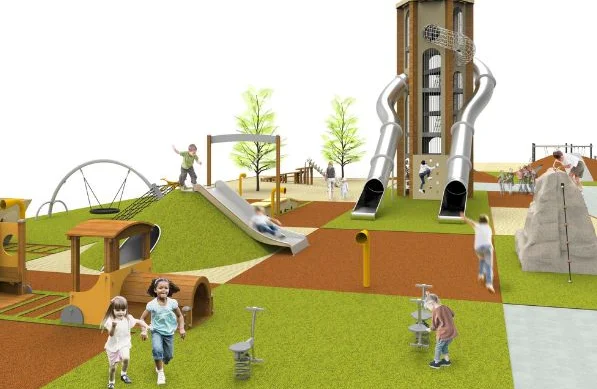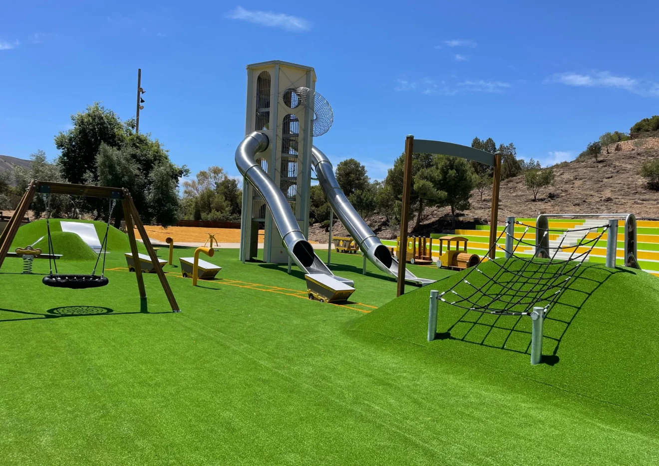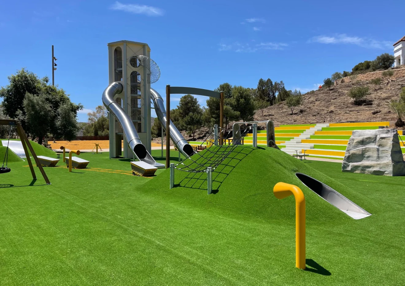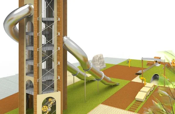 El elemento más llamativo es una torre que alcanza hasta los 9 metros sobre el suelo, con toboganes de 5 y 7 metros. Dispone de seis plantas con diferentes elementos jugables como un rocódromo, escalera de red, malla de cuerda, tubo de red trepable o un túnel de acero inoxidable.